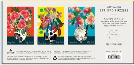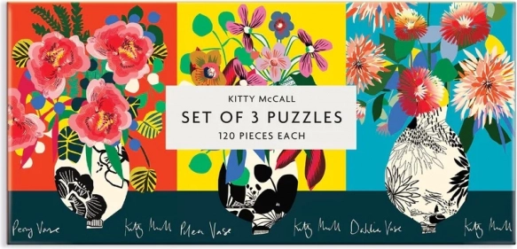 A Kitty McCall puzzle készlet három darabból álló, 120 részes kirakókat tartalmaz, élénk, színes illusztrációkkal vázákba rendezett virágkompozíciókról a nigériai származású brit művész, Kitty McCall alkotásában. Kitty McCallt a körülötte lévő természeti világ és nigériai gyermekkora vibráló tájképei inspirálták, ennek nyomán alakította ki jellegzetes stílusát: merész színek, egymásra rétegződő minták és formák, melyek geometrikus mintázatokat és virágos tájképeket hoznak létre enteriőrökhöz és kiegészítőkhöz. A külső doboz mágneses záródású. A puzzle masszív dobozba csomagolt, így újra felhasználható és tárolható. Ideális ajándéknak. A képet Kitty McCall készítette. A puzzle jelentős arányban újrahasznosított papírból készül, és prémium minőségű, ártalmatlan festékkel nyomtatott. Matt felületkezelést kapott, amely minden körülmény között hű szín- és részletvisszaadást biztosít. Hátoldala sima, kellemes tapintású bevonattal ellátott, amelynek köszönhetően az összerakott puzzle tárolásakor nem porosodik. A gondosan csomagolt elemek mellett a dobozban talál egy útmutató képet is, amely rendszerint további információkat tartalmaz az alkotókról és a mű hátteréről. Rendkívül erős, figyelemfelkeltően megmunkált, újrahasznosított kartonból készült dobozban szállítva. Fő jellemzők: 120 precízen kivágott elem, újrahasznosított és fenntartható forrásból származó anyagok felhasználásával készült, gondosan válogatott motívum neves alkotóktól és művészektől, csúcsminőségű nyomat és kivitel, útmutató kép mellékelve