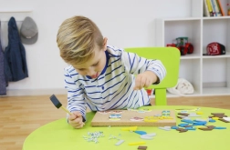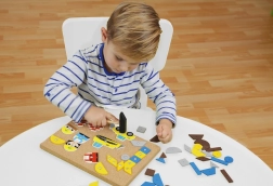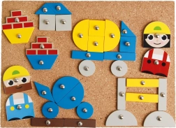 A gyermek finom motoros készségeit és pontosságát fejleszti kalapács használatakor a formák parafa táblára történő rögzítése közben.