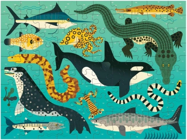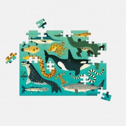 Ez az izgalmas puzzle egyik oldalán földi ragadozókat mutat be, míg a másik oldalán tengeri mélységek vadászai láthatóak. Jelentős mennyiségű újrahasznosított papírból készült, ami biztosítja az ökológiai fenntarthatóságot és a felhasznált festékek ártalmatlanságát. A matt felületkezelés hűen adja vissza a részleteket és színeket, a sima hátoldal pedig megakadályozza por kialakulását tárolás közben.