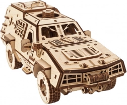 Az építés átgondolt és szórakoztató: minden alkatrész pontosan kivágott, minőségi rétegelt lemezből készül, az összeszereléshez nincs szükség ragasztóra és speciális szerszámokra. A 11 nyelvű, illusztrált útmutató végigvezet minden lépésen; a mechanizmusok legjobb működéséhez elég a mozgó részeket enyhén csiszolni és viaszolni. Hasznos extra, hogy a gumigyűrűk a felfüggesztésben és a csörlőben könnyen cserélhetők az egész modell szétszedése nélkül. A természetes fa felületet meghagyhatod, vagy festéssel és álcázó mintával díszítheted.