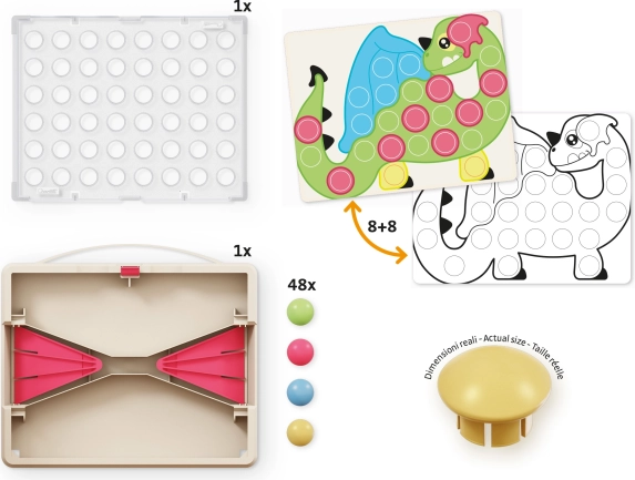 A Fantacolor Junior Play Eco+ okos fejlesztő mozaik, amely alkotásra és türelemre ösztönzi a gyerekeket. Az átlátszó, perforált táblának köszönhetően a gyerekek könnyedén helyezik be a nagy, kerek pegeket a lyukakba, és az illusztrált kártyák alapján aranyos állat- és tárgymotívumokat raknak ki.
