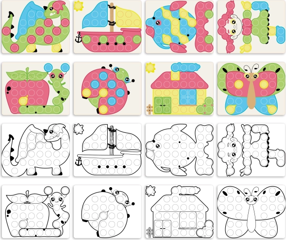 A csomag 8 illusztrált kártyát tartalmaz egyszerű és vidám motívumokkal, amelyek fejlesztik a kreativitást és a vizuális észlelést.