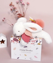 Ez az ajándékcsomag plüss nyuszival ideális társ a mindennapokban – nyugodt elalváshoz, játékhoz és a gyerekszoba ízléses díszítéséhez. A nyuszi nagyon finom anyagokból, trendi színek harmóniájában készült, és megnyugtató hatást nyújt a babának.