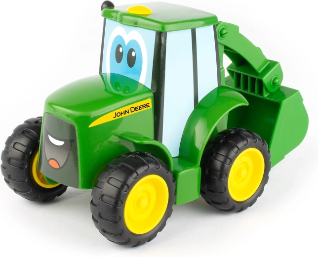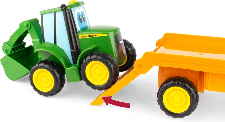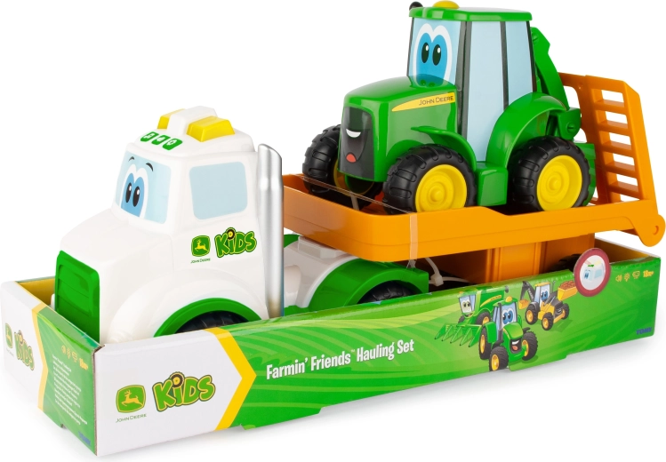 Ez a játékszett egy rámpás vontatót és a barátságos Johnny traktort kombinálja a klasszikus JOHN DEERE színekben. A gyerekek fejleszthetik finommotorikájukat a fel- és lerakodás közben, miközben a farmos szerepjátékkal a képzeletüket is ösztönzik. A 37 cm-es méretnek köszönhetően a szett jól megfogható és stabil.