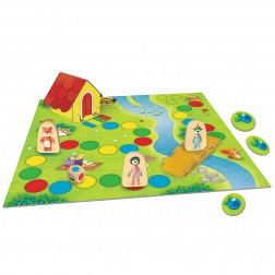 - fa (figurák és kocka), karton (tábla és zsetonok)