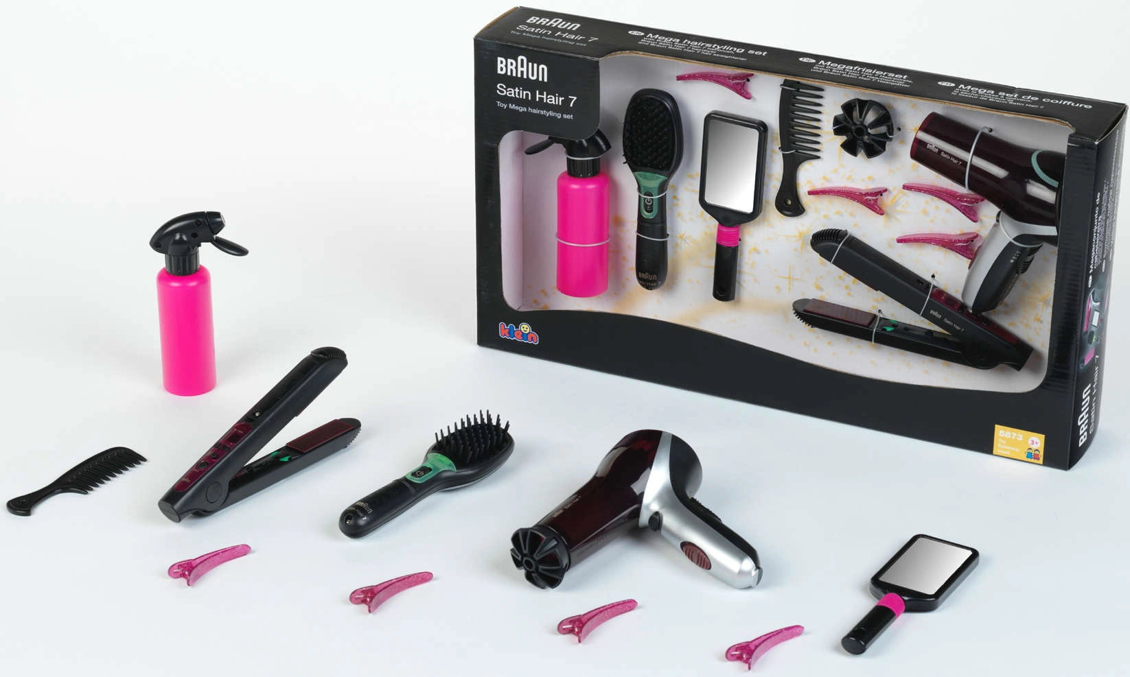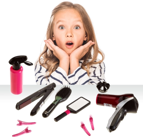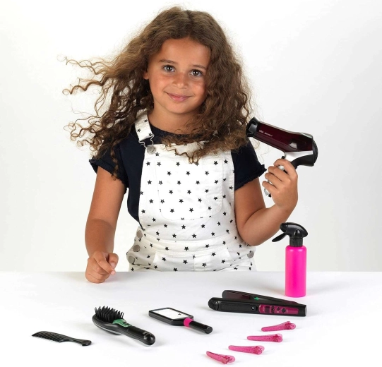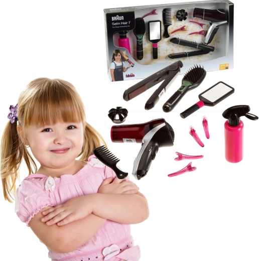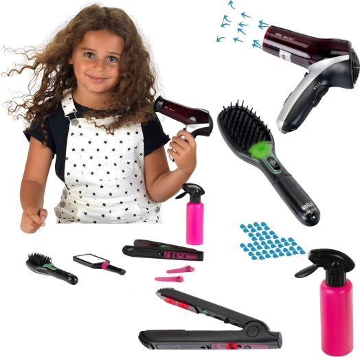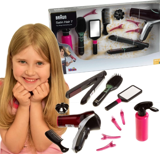 A nagy fodrászkészlet a BRAUN Satin Hair sorozat által inspirálva mindent kínál, amire a stílusos frizurákhoz szükség van. A játékok biztonságra fókuszálva készültek, és a valódi eszközöket imitálják – a hajszárító, a hajvasaló és a kefe elemmel működik, és élethű fény- és hangeffekteket produkál, miközben nem adnak le hőt és nem fújnak levegőt.