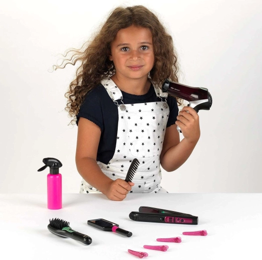 A tükör, a fésű, a permetező, a hajszárító toldata és a négy csillogó csat lehetővé teszik, hogy a gyerekek frizurákat alkossanak és órákon át játsszanak fodrászost.