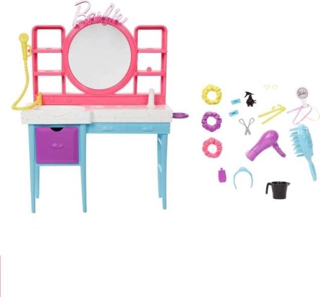 Hajtsd a fejét a mosdó fölé, és öntsd le a haját hideg vízzel a hajszárítóból, hogy aktiváld a színváltó funkciót. A víz egy kivehető tartályba folyik a könnyű tisztítás érdekében. A tükörrel ellátott pult, a szerszámpolcok, a mosóállomás és a szék valósághű élményt adnak, és támogatják a fodrászszalonos szerepjátékot.