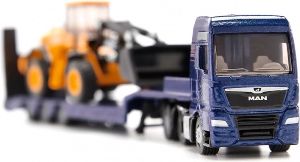 Ez a részletgazdag készlet egy kék MAN TGX vontatót mélyágyas pótkocsival és egy JCB építőipari rakodót kombinál. A strapabíró fém (die-cast) konstrukció, a precíz tamponnyomás és a szabadon futó kerekek hiteles megjelenést és funkcionalitást kínálnak. A rakodó mozgatható kanalának és a pótkocsi rámpáinak köszönhetően a gyerekek könnyedén megrendezhetik az építőgépek szállítását.