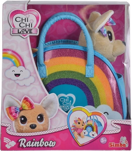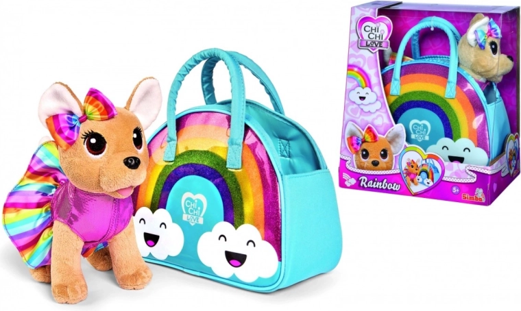 A plüss csivava kiskutya, aki egy bájos, szivárványszínű öltözéket és hozzá illő masnit visel, színes és csillogó szivárványos mintázatával örömet szerez.
