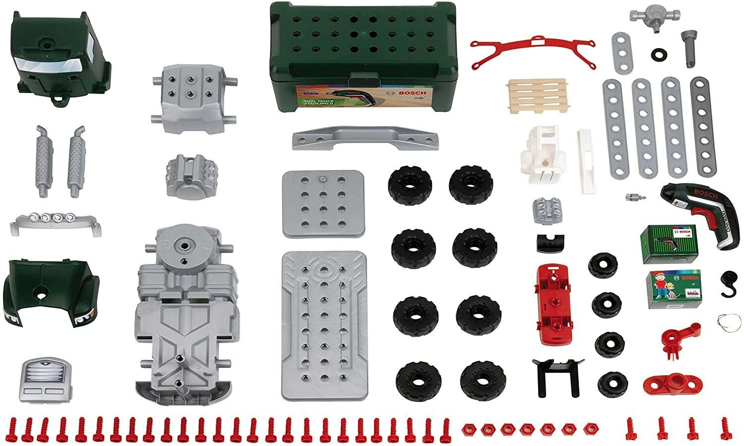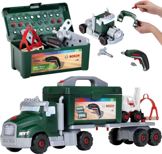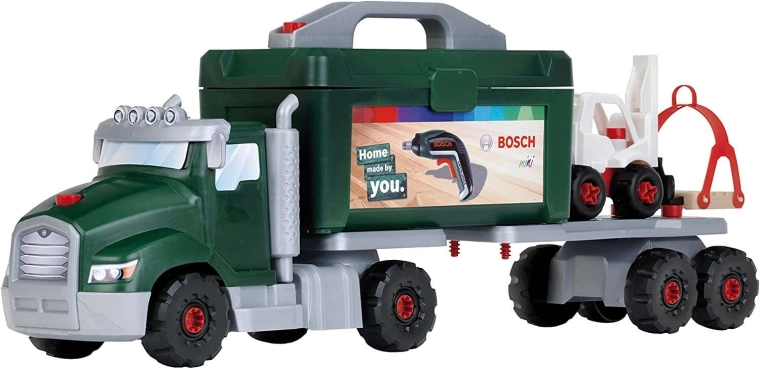 - Teherautó, levehető szerszámos doboz, utánfutó, daru, villás targonca raklappal, gyerek fúró, csavarok és építőelemek