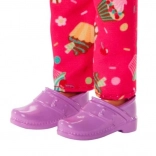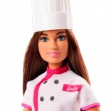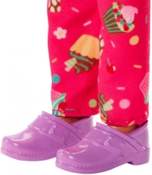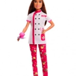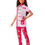 A Barbie baba fehér szakácskabátot visel rózsaszín részletekkel és séfsapkával, ami segíti őt a cukrász szerepében.