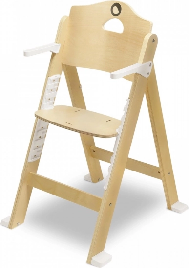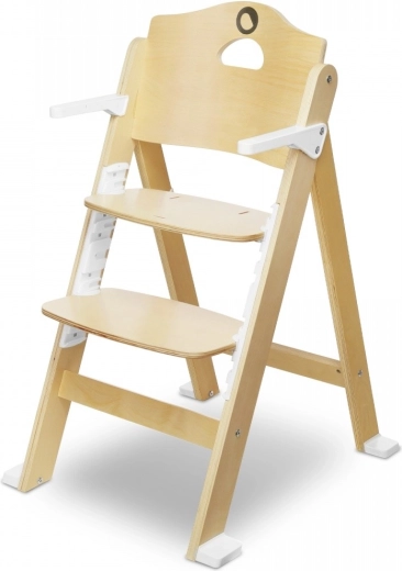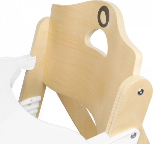 A természetes fából készült masszív váz és a tartós műanyag elemek stabilitást és biztonságot nyújtanak. Az 5 pontos biztonsági övek megbízhatóan tartják a kisebb gyermekeket, míg a nagyobbaknál a széket a tálca nélkül, közvetlenül a családi asztalnál is lehet használni. A praktikus fogantyú megkönnyíti a hordozást, a beállításhoz pedig nincs szükség szerszámra.