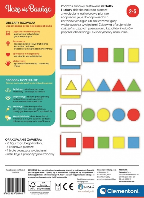 A Formák és színek készlettel játszva a gyermek a kivágott elemeket színes táblákra helyezi, és a megfelelő kartonfigurákhoz illeszti, vagy a figurákat csúsztatja a kivágásokba. A játék számos feladatot kínál a formák és színek megismeréséhez megfigyelésen és kézi kísérletezésen keresztül.