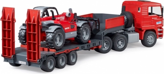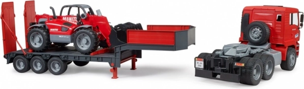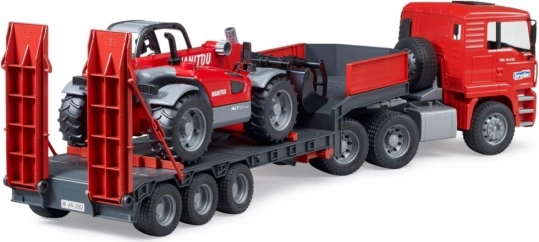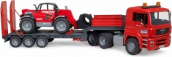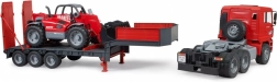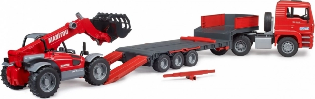 Ez a masszív készlet a MAN TGA kamion élethű modelljét kombinálja egy mélyágyas pótkocsival és a részletes MANITOU MT633 teleszkópos rakodóval. A gyerekek értékelni fogják a funkcionális elemeket, mint a lehajtható tükrök, a nyitható motorháztető, a strapabíró szélvédő, a mozgatható rámpák és a pótkocsi támaszai. A rakodó kihúzható és magasságban állítható karral, valamint levehető kanállal rendelkezik – készen minden építési kihívásra.