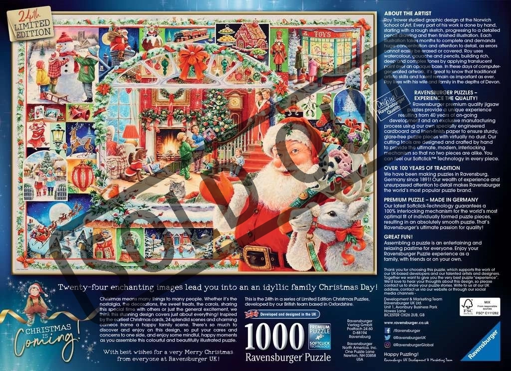 Élvezze az ünnepi hangulatot a 1000 darabos, karácsonyi motívumú RAVENSBURGER kirakóval. A magas minőségű kivitelezés, az antireflexiós felület és a SoftClick technológia a darabok tökéletes illeszkedéséért gördülékeny kirakást biztosít. Ideális relaxációhoz, a logikus gondolkodás, a türelem és a figyelem fejlesztéséhez.