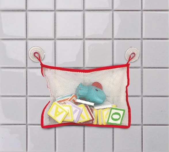 A hálós tárolózsák tapadókorongokkal segíti a játékok rendezését és szárítását a fürdőkádban.