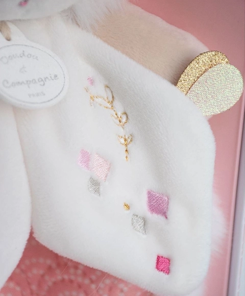 A plüssnyuszit úgy tervezték, hogy puha és kellemes legyen tapintásra, ami ideális társsá teszi a legkisebbek számára. A nyuszi vonzó bézs színű rózsaszín pocakkal, ami bájos megjelenést kölcsönöz neki. Elegáns ajándékdobozban érkezik, ami önmagában is egy kis műalkotás, így ezt a terméket ideálissá teszi ajándékozásra.
