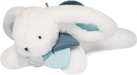Puha DOUDOU plüss nyuszi, 25 cm magas, sötétkék pomponnal – ideális társ babáknak és nagyobb gyerekeknek. Kínál nyugtató érintést, prémium anyagokat, CE szabványnak megfelelő biztonságot és könnyű ápolást. Szuper ajándék elegáns díszdobozban.