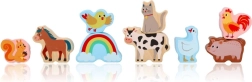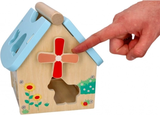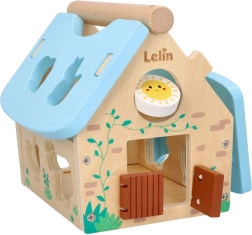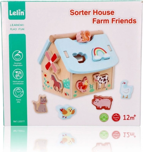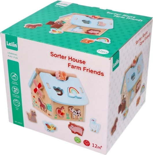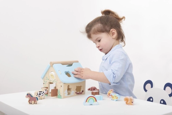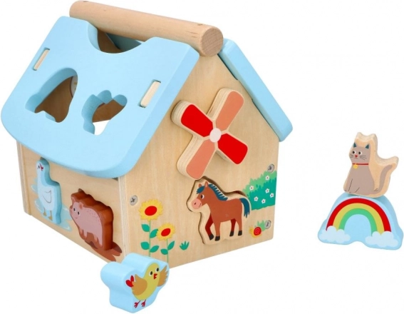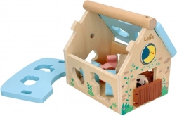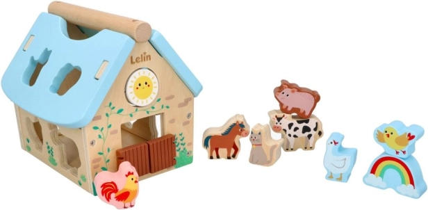 Ez a fából készült házikó állatokkal tökéletes játék a 12 hónapos kortól történő fejlődéshez. Úgy lett tervezve, hogy játék közben ösztönözze a gyerekeket a tanulásra. A házikó különböző színes formákat és állatfigurákat tartalmaz, amelyeket a megfelelő nyílásokba lehet helyezni, javítva a szem és kéz koordinációt.