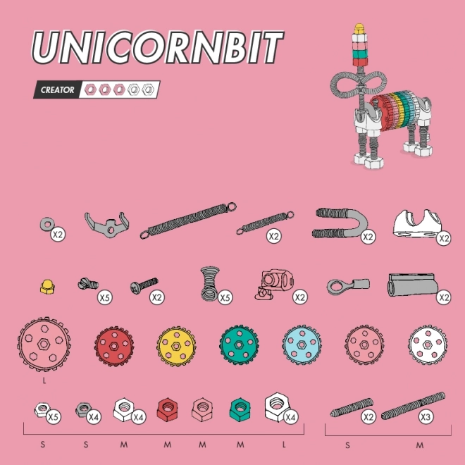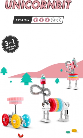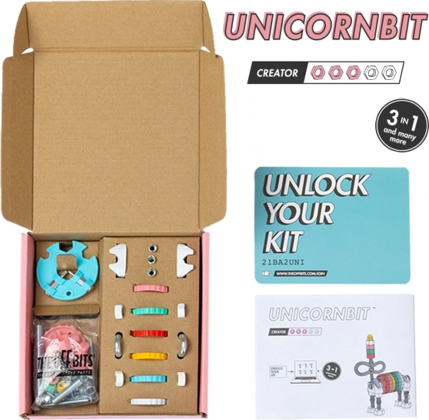 A varázslatos UnicornBit a fantázia és a műszaki ügyesség világát hozza el a gyerekeknek. Egyetlen készletből 3 különböző modellt építhet – UnicornBit, mesebeli RobotBit vagy AutoBit – és a mindennapi tárgyakkal való kompatibilitásnak köszönhetően saját, egyedi találmányokat is alkothat.