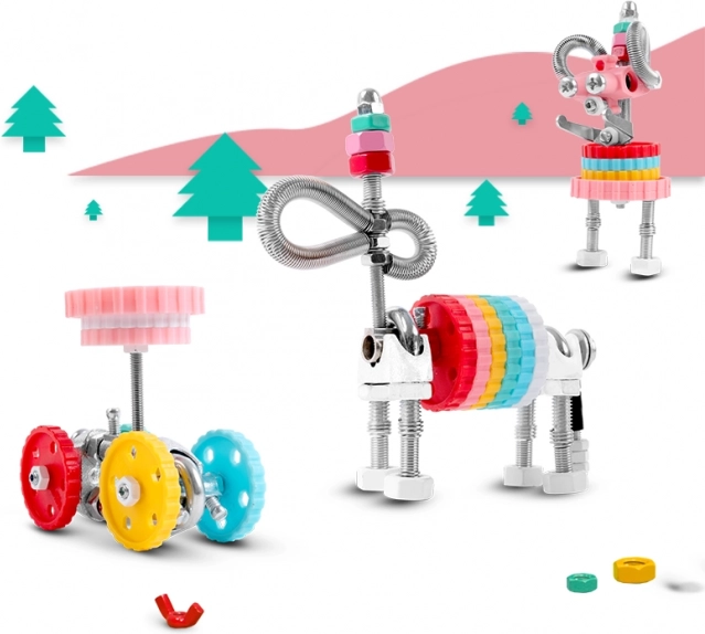 - 3 az 1-ben építőkészlet, színes anyák, csavarok, formázott bitek, összeszerelő szerszámok
