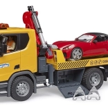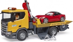 A vontatójárművek nemcsak a rosszul parkolt járművek eltávolításában segédkeznek, hanem a meghibásodott autók szállításában is. A Scania Super 560R a Bruder márkától részletes kidolgozást kínál számos interaktív elemmel:
