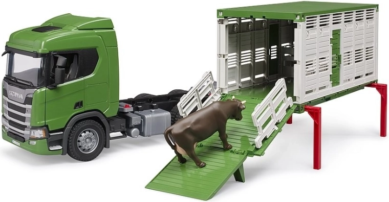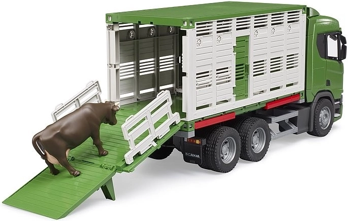 A BRUDER állatszállító SCANIA alvázon valósághű funkcióival és masszív kivitelével örömet szerez a kis gazdáknak. Kínál lehajtható és kihúzható rámpákat, nyitható ajtókat, lehajtható tükröket és belső elválasztó kapukat. Tartozék egy tehén figura, csendes futást biztosító puha gumiprofilú abroncsok, valamint bővíthető fény- és hangmodullal a még élvezetesebb játékért.