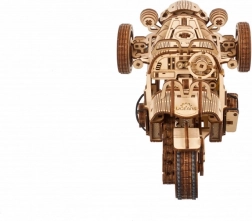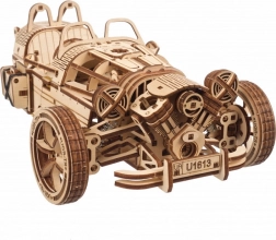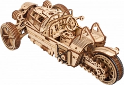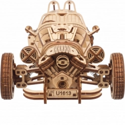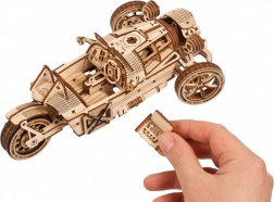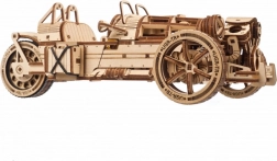 Az UGEARS UGR‑S háromkerekű a klasszikus autós bájt okos mechanikával ötvözi. A rugómotor és a lánchajtás megforgatja a hátsó kereket, a modell teljesen kormányozható, és egyenes vonalban körülbelül 4 métert képes megtenni. A váltókapcsolóval könnyen választhatsz a Park/Drive üzemmódok között, menet közben pedig működés közben láthatod a szépen kidolgozott dugattyúkat és a fogaskerekeket.