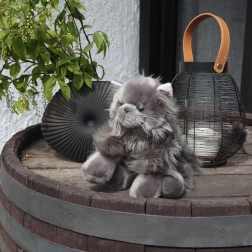 A hosszú, pihe‑puha szürke plüss, a kék szemek és a rózsaszín fülecskék hűséges kedvenccé és egyben gyönyörű díszzé teszik a cicát.