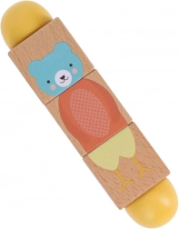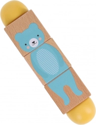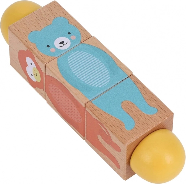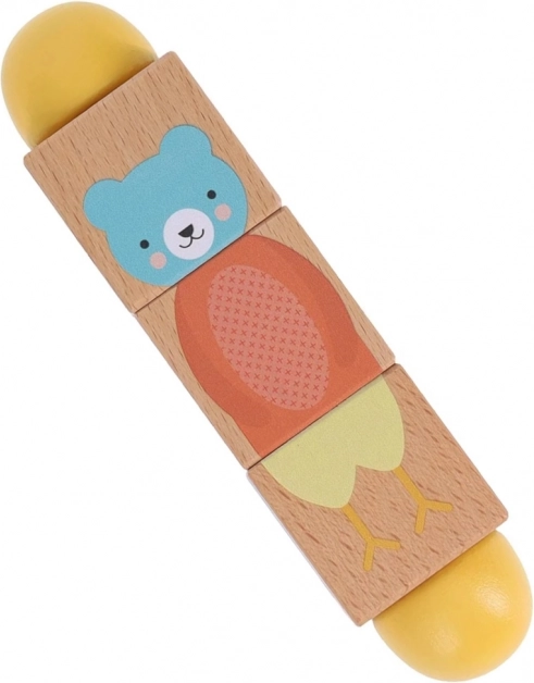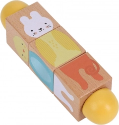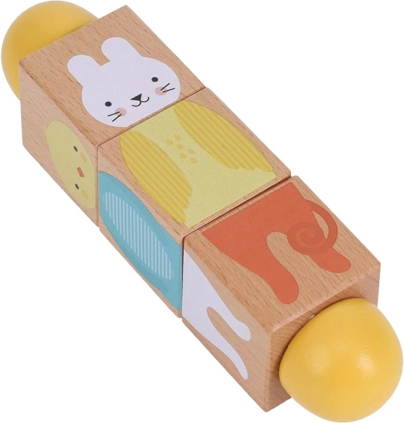 Ez a stílusos és tartós játék ötvözi a szórakozást és a tanulást. A gyerekek a három fa kocka forgatásával kirakhatják az állatok helyes részeit, vagy vicces kombinációkat alkothatnak. A sima felületnek köszönhetően kellemes a fogása, és ideális a kis kezek számára.