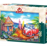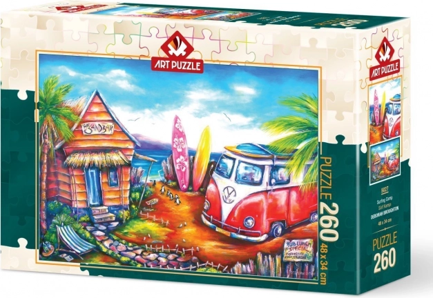 Fedezze fel a tengerparti nyári nap nyugodt hangulatát a Szörftábor kirakóval. Az ART PUZZLE 260 darabos puzzléja ideális választás a pihenéshez és a közös családi kirakózáshoz: kikapcsol, és a végén egy kb. 48 × 34 cm-es kész képpel örvendeztet meg.