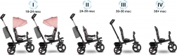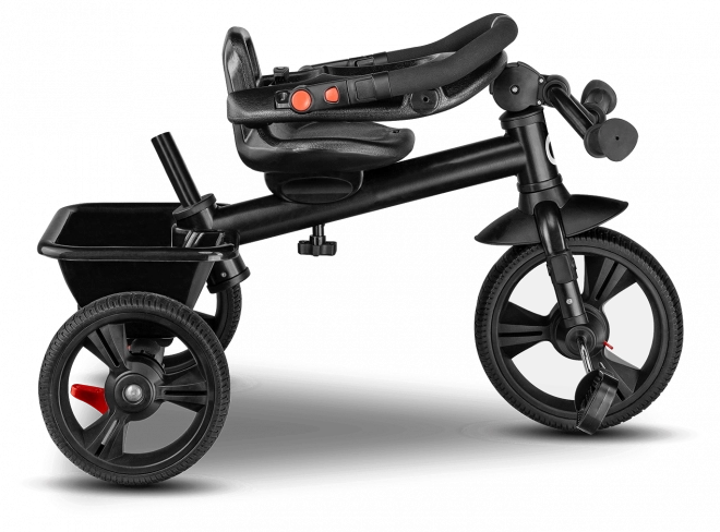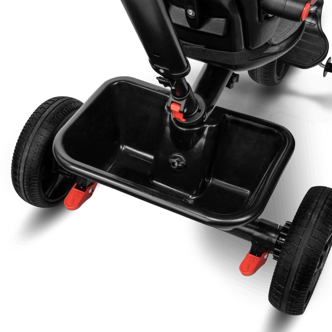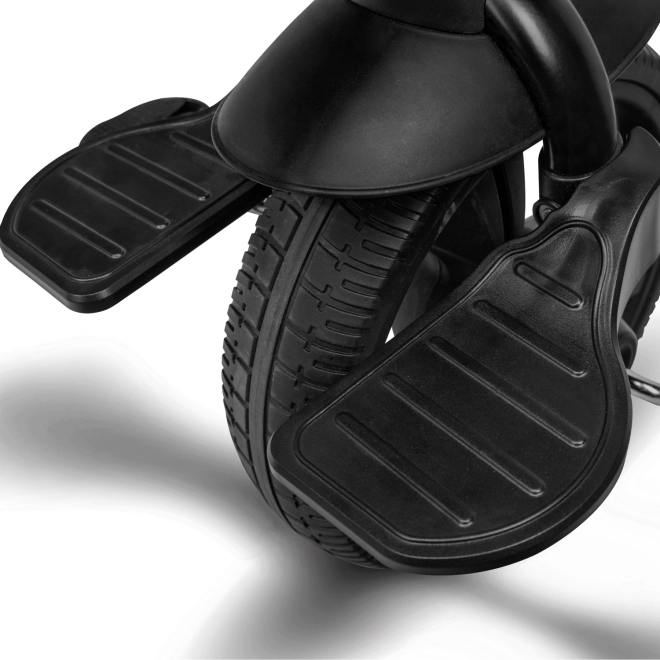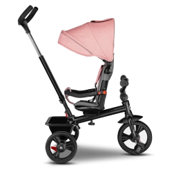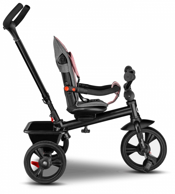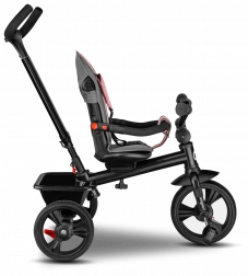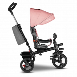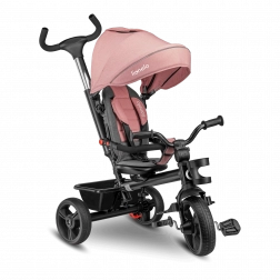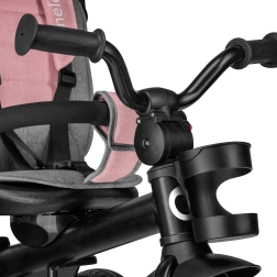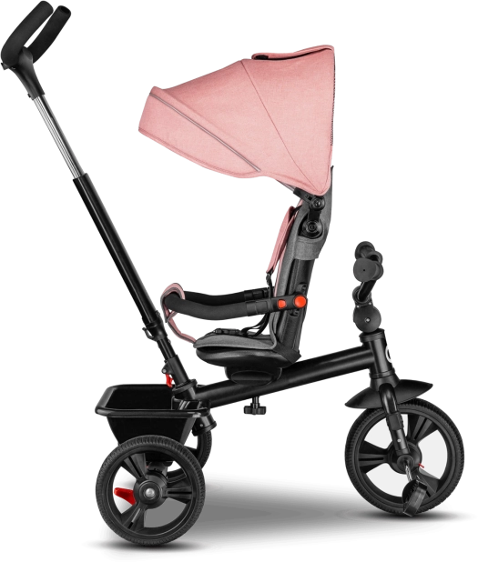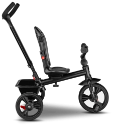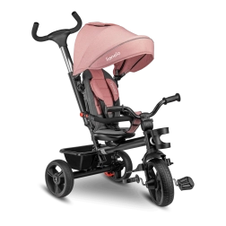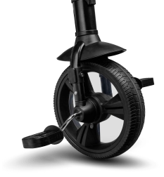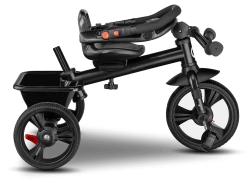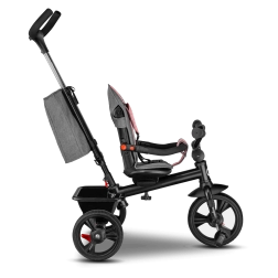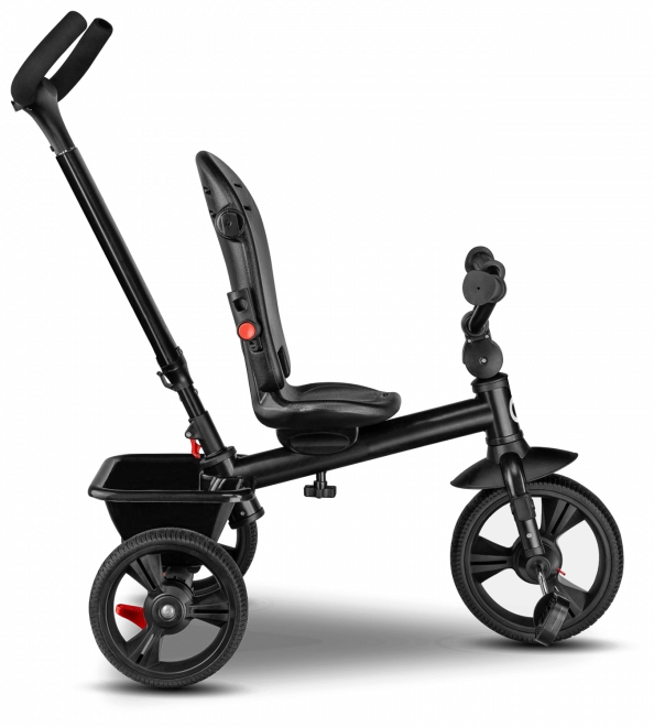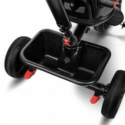 A maximális kényelemről állítható napellenző betekintő ablakkal, állítható szülőkar és praktikus felszereltség gondoskodik – kosár, táska és palacktartó. A biztonságot 3 pontos biztonsági övek, karfa, fényvisszaverő elemek és két egymástól független hátsó fékmechanizmus növeli. A tricikli könnyen, kompakt méretre hajtható, és az integrált fogantyúval összehajtva kényelmesen hordozható.