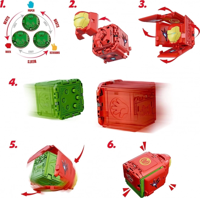 Fedezd fel az izgalmas játékot MARVEL Avengers motívumokkal, amely ötvözi az egyszerű szabályokat, a gyűjthető elemeket és a pörgős akciót. Minden kocka a kedvenc hősöd maszkja alatt rejti a követ, ollót vagy papírt. Állítsd be a lépést, fedd le maszkkal, dobd egymásnak a kockákat, és derüljön ki a győztes – a kő legyőzi az ollót, az olló legyőzi a papírt, a papír pedig legyőzi a követ.