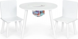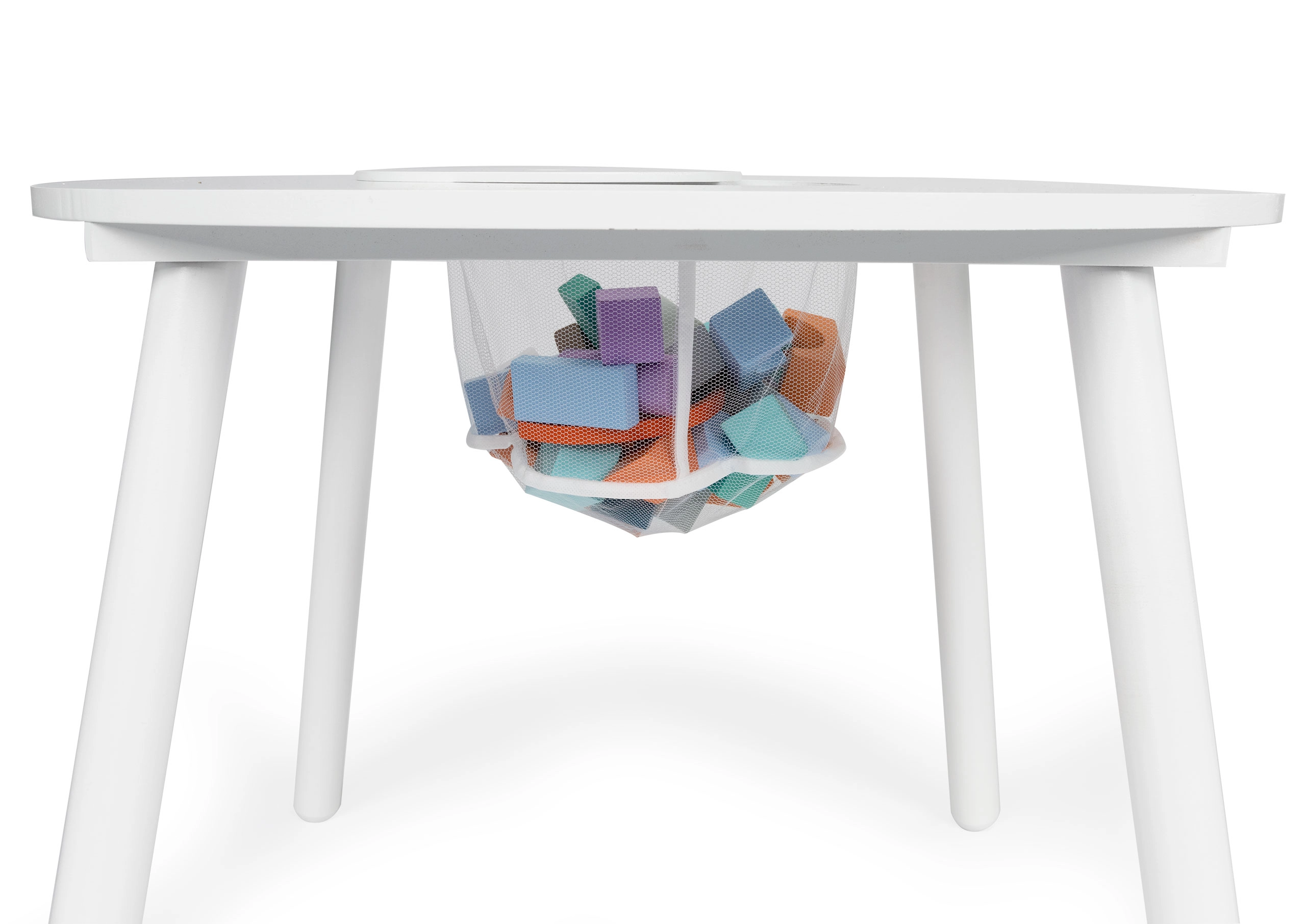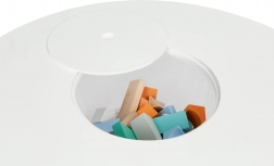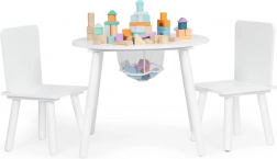 A praktikus, felnyitható középső fedél egy hálós kosarat rejt, ahová a gyerekek pillanatok alatt elrakhatják a kockákat, ceruzákat vagy az apró játékokat. A szett skandináv stílusú, modern enteriőrbe illeszkedik, és tökéletes gyerekszobákba, játszósarkokba és váróhelyiségekbe.