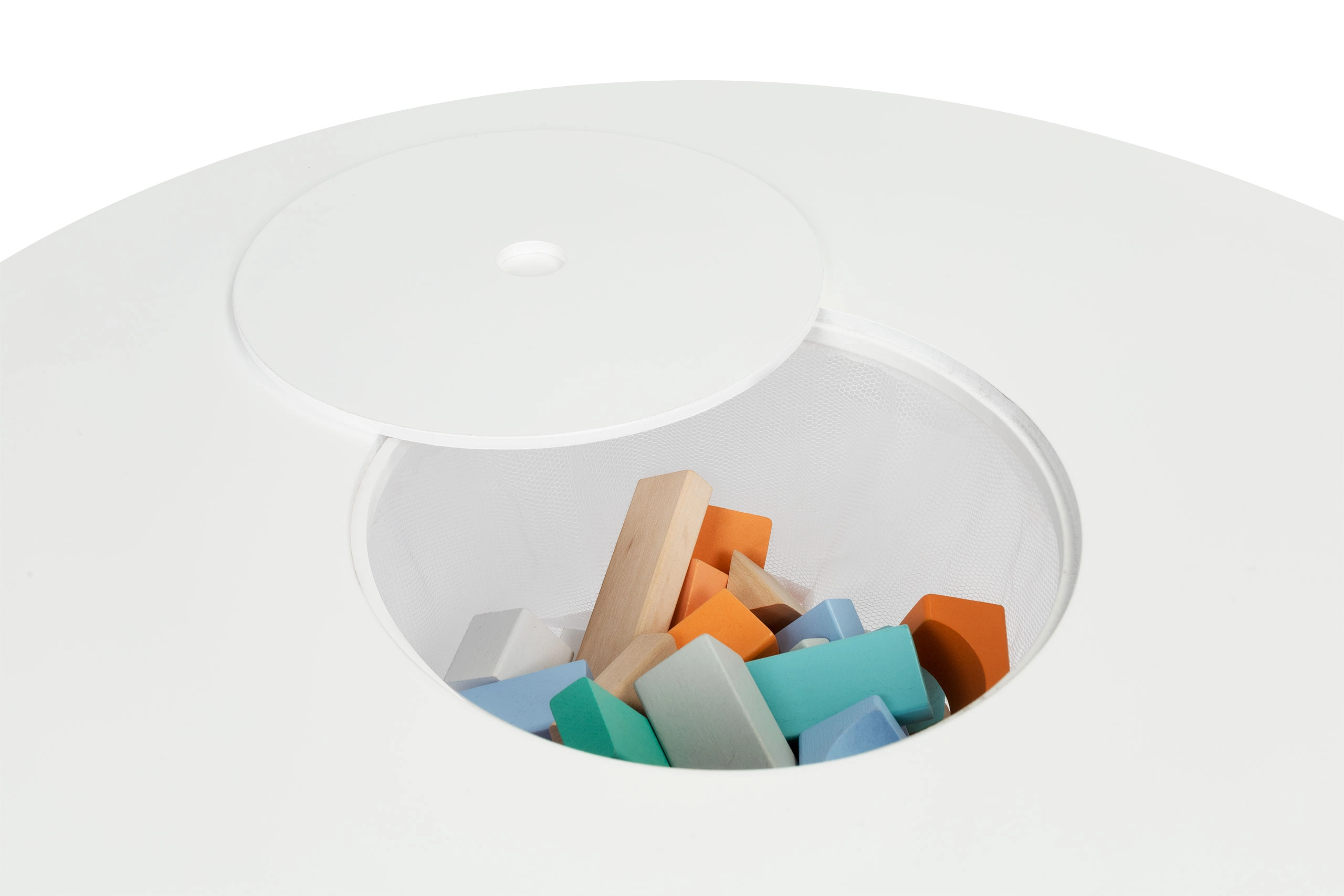 A felnyitható középső fedél praktikus hálós kosarat rejt – tökéletes építőkockákhoz, ceruzákhoz és apró játékokhoz. A rendrakás csak pár másodperc, a munkafelület pedig tiszta marad.