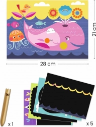 A DJECO készlettel a legkisebbek is élvezhetik az első alkotást rendetlenség nélkül. A nagy kaparókártyák állatos motívumai a színek és formák felfedezésére hívnak. A kétoldalas fa toll szélesebb oldala a nagyobb felületekhez, élesebb hegye pedig az apró részletekhez való. A gyerekek felfedhetik részletekben, vagy lekaparhatják az egész felületet – az eredmény mindig szép és örömteli lesz.