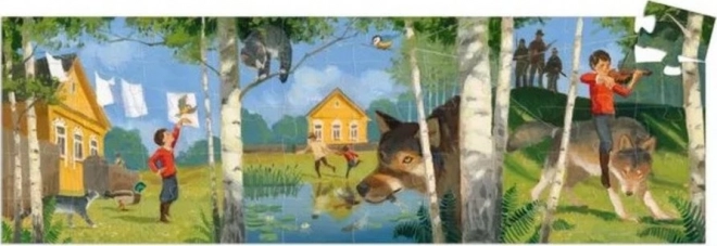 Fedezze fel a Péter és a farkas mese költői világát a DJECO panorámaképes puzzle-jével. Az 50 strapabíró darab segítségével a gyerekek gyakorolják az aprómozgásokat, a logikus gondolkodást és a türelmet, miközben élvezik a gyönyörű illusztráció összeállítását. A kész puzzle megközelítőleg 62 × 20 cm, és kiválóan alkalmas kiállításra.