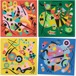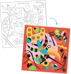 Ez a kreatív készlet szórakozást és oktatást egyaránt kínál egy csomagban. Négy illusztrált kártyát tartalmaz, amelyeket a gyerekek díszíthetik tizenkét különböző színes homokkal. A készlet műanyag eszközt és egy részletes füzetet tartalmaz, amely lépésről-lépésre útmutatást nyújt az alkotáshoz. A gyerekek megtanulják Wassily Kandinsky műveit és technikáit, anélkül, hogy rendetlenséget csinálnának, mivel zárt dobozban dolgoznak, ami segít a homokot a helyén tartani.