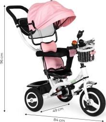 A tricikli tartós kerekekkel van felszerelve, amelyek lehetővé teszik az utazást egyenetlen felületen, és a hátsó kerekek fékje megakadályozza a tricikli véletlen mozgását. Az összecsukható lábtartók lehetővé teszik a kényelmes utazást a legkisebbek számára is.