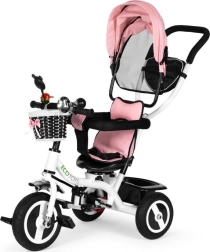 Az ECOTOYS tricikli puha háttámlával és biztonsági övekkel kínál kényelmet és biztonságot gyermekének. A forgatható tető eső és nap ellen is véd.