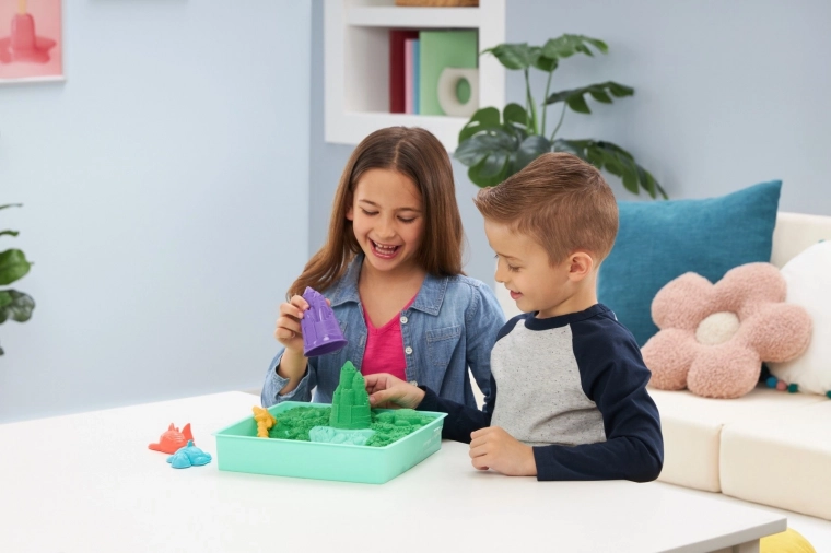 Az eredeti Kinetic Sand selymes tapintású, szépen folyik, miközben könnyen vágható, gyúrható és formázható. Ideális rendetlenkedés nélküli érzékszervi játékhoz.
