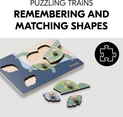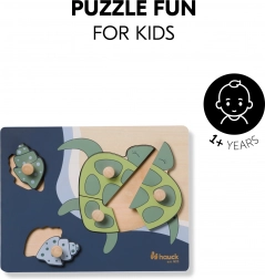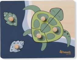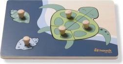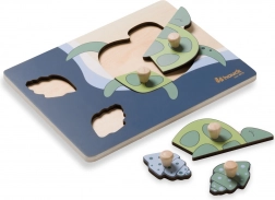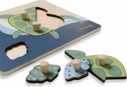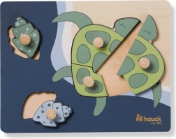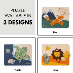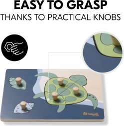 A fogantyús Teknős fa puzzle kifejezetten a kis gyerekkezekhez készült. Minden elem fa gombbal ellátott a könnyű megfogás és a pontos behelyezés érdekében. A kirakással a gyermek finommotorikát, kéz–szem koordinációt, memóriát, valamint a formák és színek felismerését gyakorolja. A lekerekített élek biztonságos játékot garantálnak már 12 hónapos kortól.