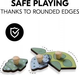 Minden elem fa gombbal rendelkezik, ami megkönnyíti a gyermekek számára a felemelést és a pontos behelyezést a megfelelő helyre – tökéletes kezdőknek.