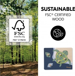 Tartós, FSC tanúsítvánnyal rendelkező fa és lekerekített élek biztosítják a biztonságos, környezettudatos szórakozást 12 hónapos kortól.