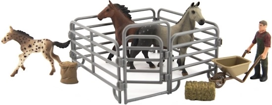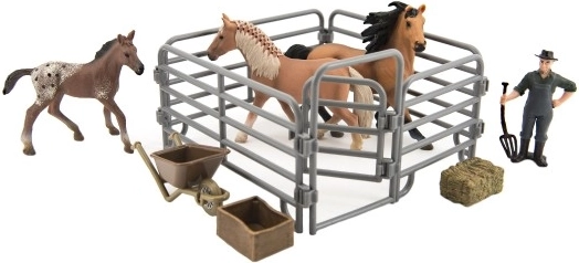 Ez a háztáji farm készlet ideális játék a 3 éves kortól kezdődő gyerekeknek, akik szeretnék kipróbálni magukat farmerként. A készlet mindent tartalmaz, ami egy hiteles élményhez szükséges: lovak, farmer figura, talicska szalma bálával, zsák és korlát. A részletes kidolgozás valósághű megjelenést kölcsönöz minden figurának.