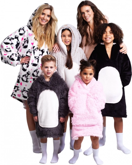 Ez a kapucnis pulóver és takaró egyben a mindennapi kényelemre készült. Az oversize szabás nem korlátozza a mozgást, miközben a puha anyagok kellemes meleget adnak. A pandaminta játékos megjelenést kölcsönöz, és remek ajándék nőknek és férfiaknak egyaránt.