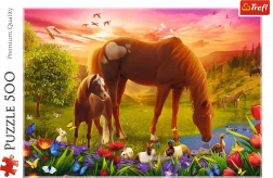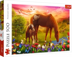 Fedezze fel a kikapcsolódást ezzel a lovak a réten motívumú, 500 darabos gyönyörű kirakóval. Összeállítás után a kép mérete 480 × 340 mm. Lengyelországban készült minőségi, környezetbarát anyagokból, speciális kalanderezett papírral a jobb fényvisszaverésért és a kényelmesebb kirakásért.