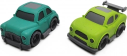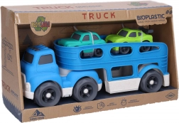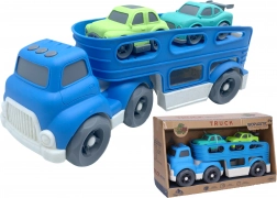 Autószállító teherautó autók szállítására 30 cm-es mérettel és két kicsi autóval, amelyek mérete 9 cm. Ez a modell szabadon forgó kerekekkel ideális a kis autórajongóknak.