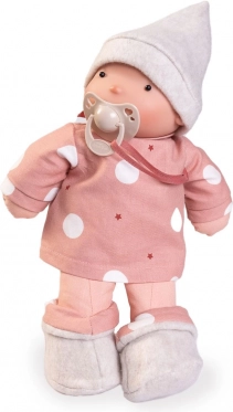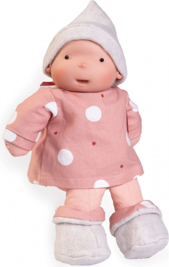 Ez a finom baba kifejezetten csecsemők és kisgyermekek számára készült. Környezetbarát anyagokat és biztonságos kivitelezést ötvöz: a test és a végtagok organikus pamutból, az élethű fej 100% szilikonból készül, a töltet pedig puha, újrahasznosított PET szál. A csomag része egy mágneses cumi bio organikus anyagokból, természetes pigmentekkel.
